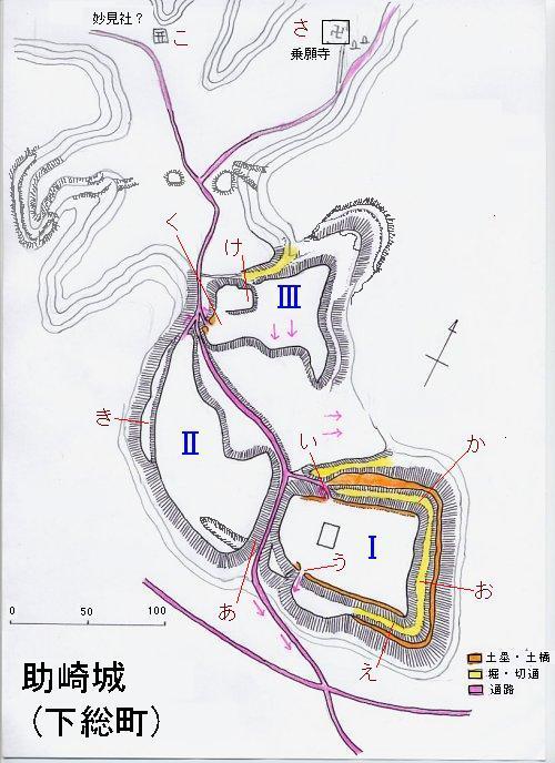 助崎城は下総町と成田市との境界付近にある。成田市の「祥鳳院」と北に向かい合った比高20mほどの台地が本丸である。