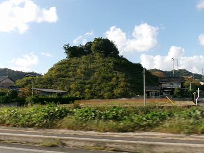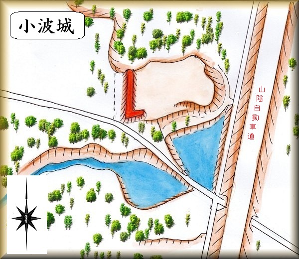 小波城は山陰自動車道のすぐ西側の比高10mほどの低い丘陵先端部分に築かれている。