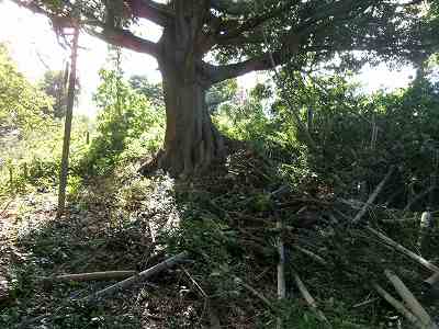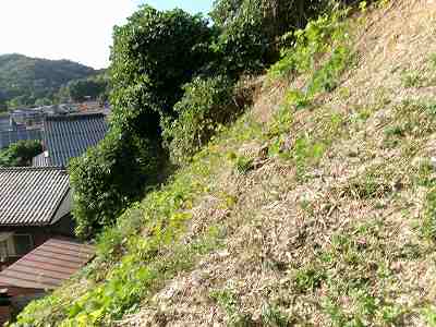 その上の台地が城址だったと思われるが、現状では城址全体がヤブとなっており、内部に進入することも容易ではない。