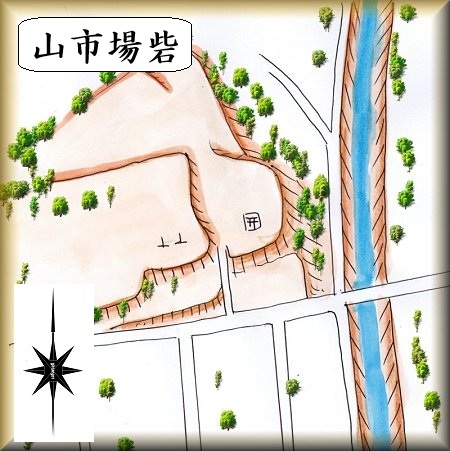 山市場砦は、日野川の南側、日野川の支流の上の比高15mほどの台地先端部にあったという。